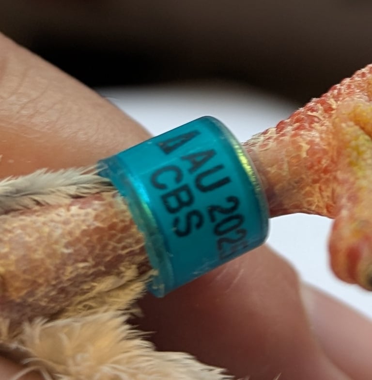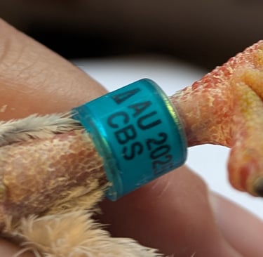 Life bands show the code for the national organization (this band shows AU for the American Racing Pigeon Union), the year the pigeon was bred (in this example, 2025), and the club code for the club that the breeder of the bird belongs to. This bird has a "CBS" club code, which indicates that it was bred by a breeder at the Continental Breeding Station in Oklahoma.